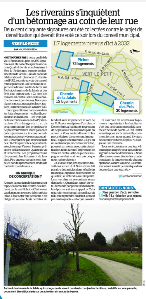 Dans son édition du 24 janvier 2017, le Parisien s’est fait l’écho des nombreuses inquiétudes des Vertois au sujet du projet de plan local d’urbanisme (PLU) et a relayé l’action de notre association.